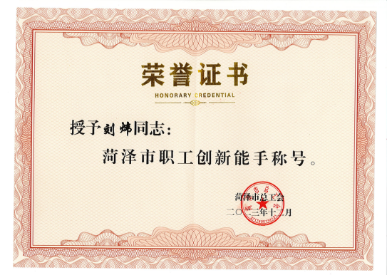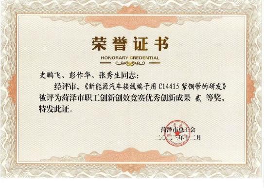 为深入学习贯彻习近平新时代中国特色社会主义思想、党的二十大精神和中国工会十八大精神,进一步增强经济社会发展创新力,引导全市企事业单位发挥创新主体作用,动员激励全市广大职工全面参与创新,最大限度释放全社会创新创业创造动能,为打造六个新菏泽贡献创新力量,2023 年菏泽市总工会继续在全市开展了菏泽市全员创新企业、菏泽市职工创新创效竞赛优秀创新成果、菏泽市劳模和工匠人才创新工作室、菏泽市创新型班组、菏泽市职工创新能手等职工创新创效竞赛活动。经过严格评审,我公司《新能源汽车接线端子用C14415紫铜带的研发》参赛项目从多项参赛成果中脱颖而出,荣登二等奖榜单,刘炜同志被授子“菏泽市职工创新能手”称号,并给予物质奖励。