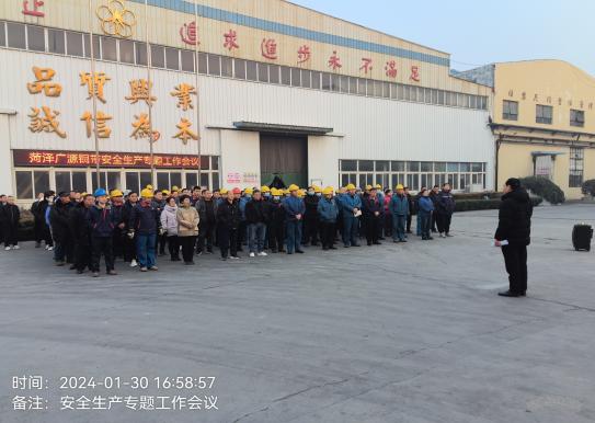 春节近至,为深刻吸取全国近期安全事故教训,全面贯彻落实习近平总书记关于安全生产的重要讲话、重要指示批示精神和菏泽城投控股集团关于安全生产系列部署,切实做好节日前后的安全生产工作,山东天和铜业(集团)有限公司及权属广源铜带、天和铜箔公司分别召开安全生产专题工作会议。公司总经理冯守森主持会议并传达集团工作会议精神和工作要求,菏泽城投控股集团副总经理王世安出席会议并讲话,广源铜带和天和铜箔公司分别开展会议动员和工作部署。