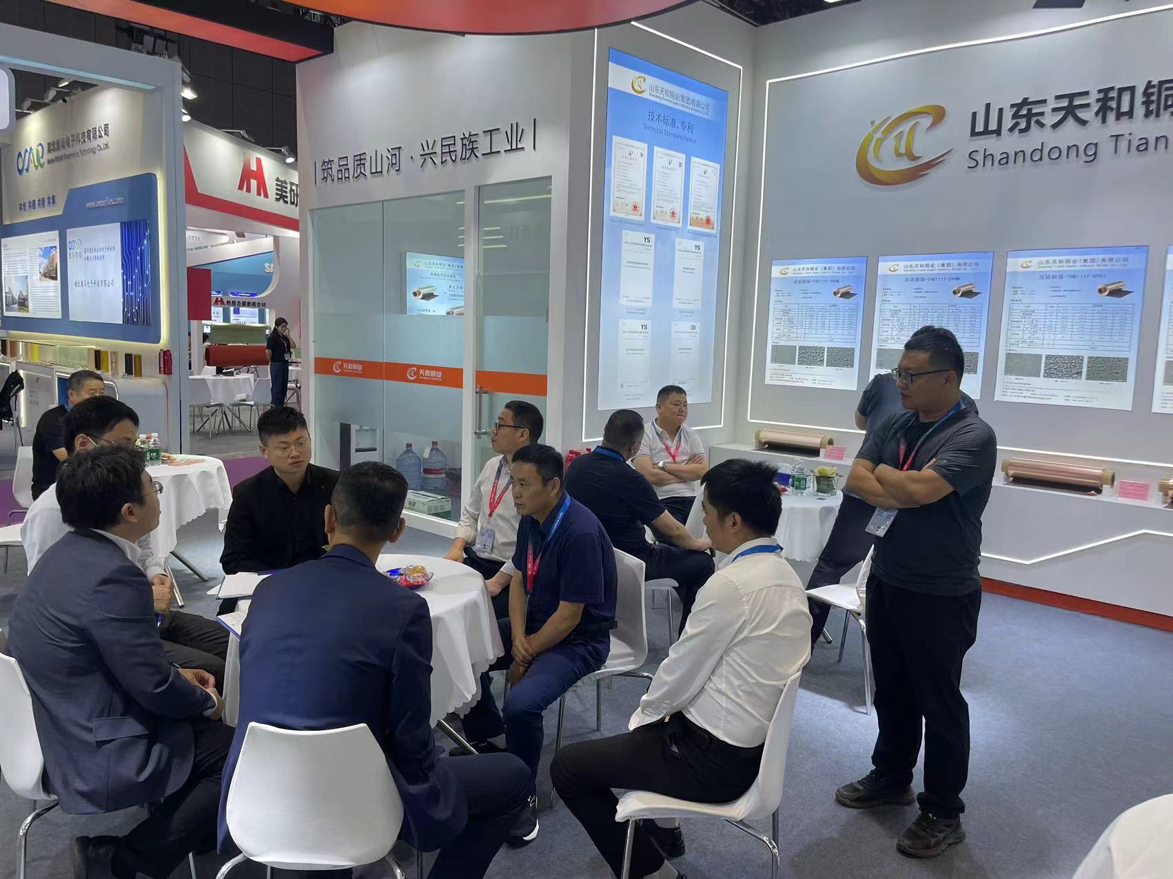 山东天和铜业集团展台向来宾们集中展示了黑化处理压延铜箔 、无胶黑化处理压延铜箔、红化处理压延铜箔和新能源用压延铜箔等系列产品。参展期间,前来展台了解、洽谈业务的上下游合作伙伴、参观的客户和经销商络绎不绝,并进行交流、洽谈,进一步扩大公司在市场中的知名度和影响力。