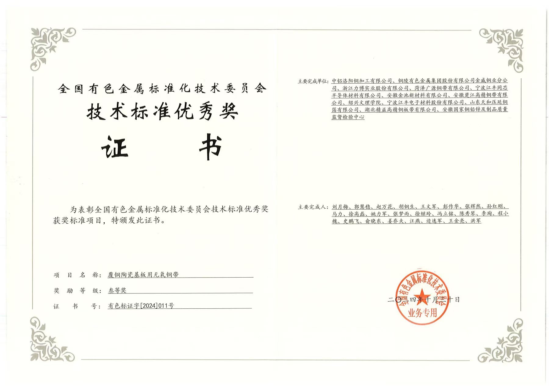 近日,山东天和铜业集团传来喜讯,权属公司菏泽广源铜带有限公司和山东天和压延铜箔有限公司参与的标准项目《覆铜陶瓷基板用无氧铜带》荣获了2024年度有色标委会技术标准优秀奖三等奖。