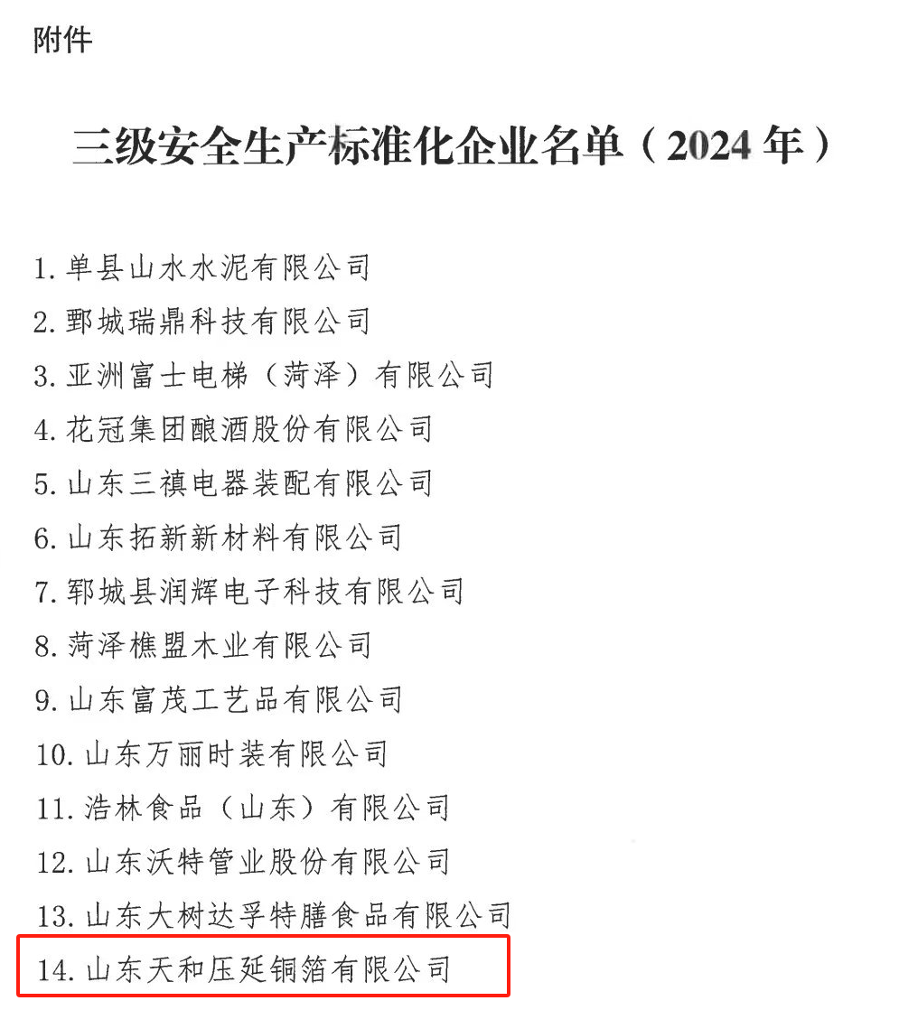 喜讯:山东天和压延铜箔有限公司被评定为三级安全生产标准化企业
