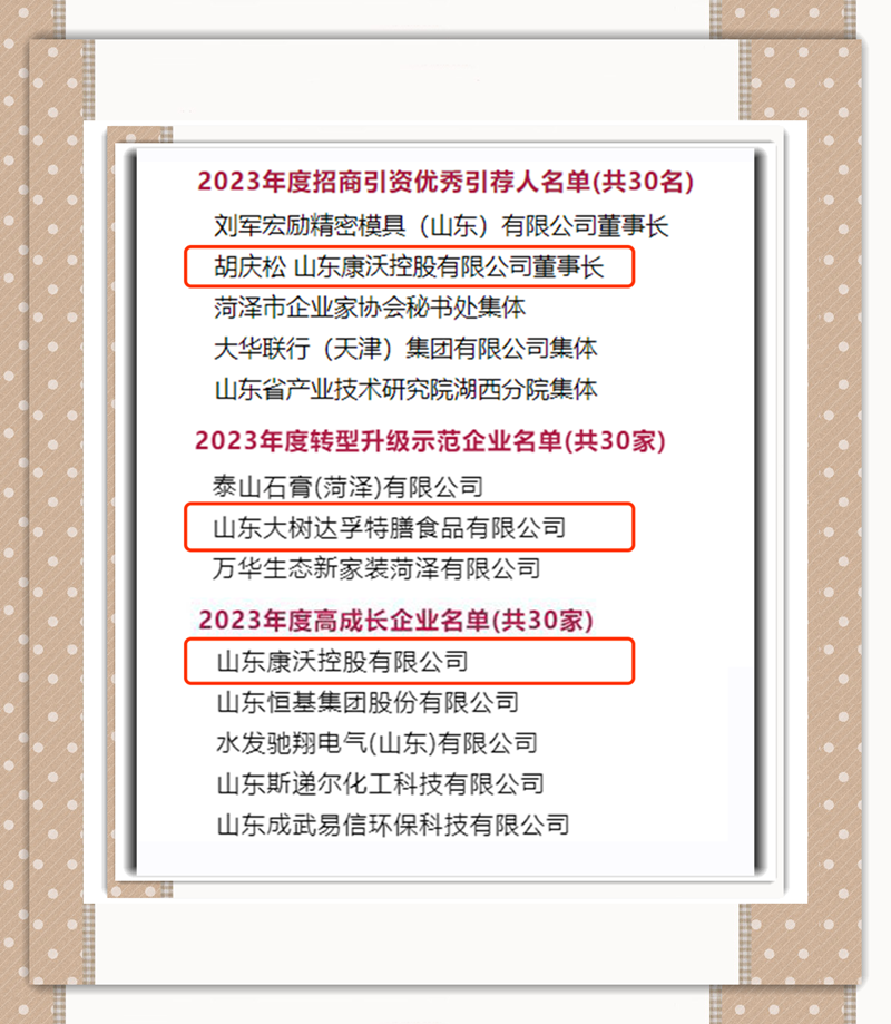 2月19日,在菏泽市委、市政府召开的“新春第一会”——全市高水平开放暨高质量招商引资大会上,菏泽城投控股集团权属企业大树达孚公司被市委、市政府评为“2023年度转型升级示范企业”,康沃控股公司被市委、市政府评为“2023年度高成长企业”、公司董事长胡庆松获得“优秀引荐人”荣誉称号。