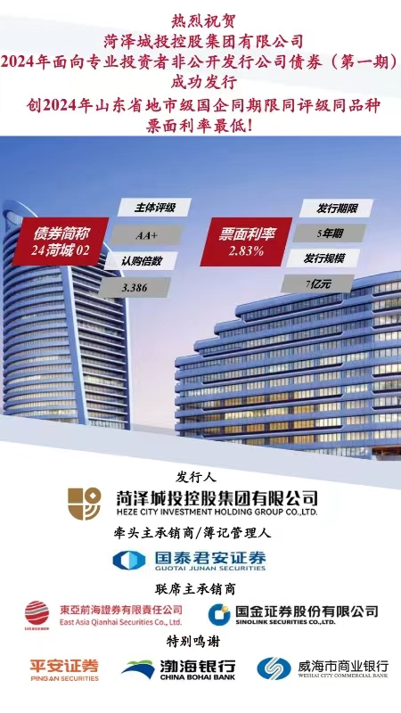 6月27日,菏泽城投控股集团有限公司以2.83%的低利率成功发行7亿元面向专业投资者非公开发行公司债券(第一期)(债券简称:“24菏城02”),创2024年山东省地市级国企同期限同评级同品种票面利率最低,创2024年山东省全省(含省属)同期限同品种票面利率第五低。本次债券的成功发行,对降低市属企业融资成本,展现市属企业市场形象,提高市场投资者对菏泽市属企业及当地经济发展的投资信心起到了很好的示范作用。